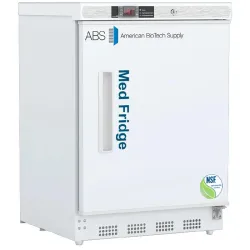This built-in undercounter vaccine refrigerator from American Biotech Supply is designed to comply with NSF/ANSI 456 standards for safe vaccine storage, maintaining temperatures from 2°C to 8°C (36°F to 46°F). It uses HFC-free refrigerant (R600a isobutane) for energy efficiency and environmental health.
