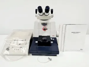 The Leica Reichert Ultracut S Ultramicrotome with Controller is a precision instrument designed for producing ultra-thin sections necessary in detailed microscopic examinations. Previously part of a university lab, this unit was declared surplus while remaining in good cosmetic condition with only minor marks. All units power up smoothly, ensuring mechanical soundness of the microtome, although only the top light is operational. The set includes two eyepieces from Cambridge Instruments (Part#: 31-05-62) and comes with the Leica Reichert AG Control Panel (Model: 654901, Serial#: 89378). This equipment is ideal for researchers requiring high-quality sectioning for electron microscopy and various scientific analyses.