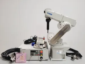 The Mitsubishi Melfa RV-6S is a well-maintained industrial robotic arm, accompanied by the CR2B-574 control unit and R28TB teach wand, originating from a university surplus. The arm features a 6-axis mechanism, enhanced with a heated ACTOR probe, and weighs 58 kg. Both the controller and power supply unit are operational, though further testing is not possible at our facility. This sturdy setup is ideal for advancing industrial automation tasks.