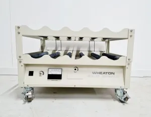 The Wheaton Modular Roller Apparatus, model number 348970CE, is a high-quality, robust system designed for extensive cell culture applications in laboratory settings. Recently acquired from a university lab where it was no longer needed, this unit is fully operational despite the absence of its speed adjustment knob. Its 2-tier design, equipped with 12 rollers, offers generous space for cell cultivation with roller areas measuring 52 cm by 67 cm each. Trusted for its reliability and effectiveness, this equipment is an excellent choice for advanced cellular, tissue, and bioreactor processes.