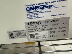 The Barkey plasmatherm is a specialized plasma thawing system engineered for controlled thawing of plasma and other blood components, essential in clinical diagnostics and bioprocessing workflows. It features a digital control panel that enables precise temperature management, ensuring sample integrity during the thawing process. Designed to operate on a voltage range of 100–120 VAC at 50/60 Hz frequency, it consumes 1350 W of power for efficient warming performance. This thawing unit is widely adopted in molecular diagnostics laboratories and biopharmaceutical production pipelines that require reliable and reproducible thawing of sensitive blood products. Compact and robust, the plasmatherm system supports critical applications in biotechnology fields such as gene editing and synthetic biology, where accurate handling of plasma samples is paramount.