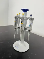 The Eppendorf Research Plus single channel pipettes are precision manual pipettors widely adopted in molecular biology, synthetic biology, and biotechnology laboratories. This set includes six single channel pipettes mounted on a compact stand with a base diameter of approximately 6 inches for organized storage and easy access.