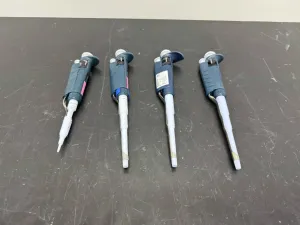 The Gilson Pipetman Single Channel micropipettes are precision manual pipetting tools designed for accurate volume measurement and transfer, crucial in molecular diagnostics, synthetic biology, and bioprocessing workflows. This lot includes 4 single channel pipettes, each engineered for ergonomic handling and reliable volume adjustment, supporting a wide range of liquid volumes typically between 0.5 µL to 1000 µL depending on specific Pipetman models.