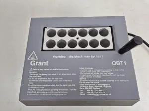 The Grant QBT1 is a digital dry block heater designed for accurate temperature control in laboratory settings, particularly suited for molecular biology, biochemistry, and wet lab workflows. This compact unit provides consistent, dry heat incubation for a variety of applications, including: