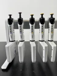 Set of 7 INTEGRA Biosciences Multichannel Pipettes with Stand, designed for precise liquid handling in laboratory applications. Includes a sturdy stand for organized storage and easy access.