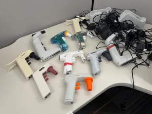 This lot comprises 10 manual pipette controllers featuring various ergonomic designs, including different trigger mechanisms and speed control knobs to optimize liquid handling accuracy. These controllers are essential tools in biomedical engineering, molecular diagnostics, and biotechnology laboratories for manual pipetting tasks involved in sample preparation, molecular cloning workflows, and bioprocessing applications.