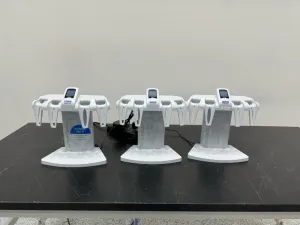 The Rainin SmartStand Electronic Pipette Stands provide a reliable solution for secure docking and continuous charging of Rainin electronic pipettes. Designed with an intuitive touchscreen interface, these stands allow users to manage multiple electronic pipettes simultaneously, thereby enhancing productivity in precision liquid handling workflows. Each stand supports various pipette models, making it adaptable for diverse biotechnology and molecular diagnostics laboratories. The compact design minimizes bench space usage while streamlining workflow efficiency. With continuous pipette readiness monitoring, the SmartStand is essential for applications requiring meticulous bioprocessing and gene editing protocols, widely used in molecular biology and biopharmaceutical production pipelines. The set includes three stands, ideal for laboratories aiming to optimize organization and workflow in advanced biomedical engineering and synthetic biology research environments.