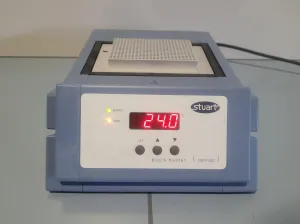 The STUART SBH130D Digital Block Heater/Dry Bath is designed for precise temperature control in biotechnology and molecular diagnostics applications requiring uniform heating of 384-well microplates.
