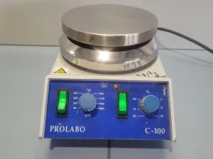 The PROLABO C-100 Magnetic Heating Stirrer, by J.P. SELECTA, offers reliable performance with a power rating of 640 W and operates on a 230 V, 50-60 Hz supply. It features a temperature range from 0 to 300 ºC and a maximum rotation speed of 1600 rpm. The heating plate has a diameter of 14.5 cm and can accommodate a stirring volume of up to 3 liters of water. The device is in excellent working condition, ensuring precise and efficient mixing for your laboratory needs.
