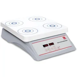 The Ohaus STMP4DG Multi-Position Digital Magnetic Stirrer, designed for precision and advanced control in laboratory environments. This digital model is equipped with an LED display that provides clear visibility of speed settings and operational status, enhancing the accuracy and repeatability of your experiments. With four stirring positions, the STMP4DG is perfect for a variety of applications, including dissolution studies, titrations, and synchronized stirring of multiple samples. The stirrer allows precise speed adjustments from 60 to 1400 rpm, enabling users to achieve consistent results across all positions. Constructed from durable cast aluminum with a chemical-resistant glass-filled nylon top plate, the Ohaus STMP4DG ensures long-term durability and resistance to chemical spills. The unit features a microprocessor-controlled system with a speed ramping feature that smoothly increases motor speed, preventing splashes and enhancing magnetic coupling for effective stirring.