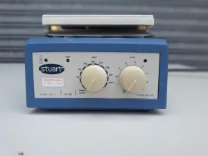 This listing is for a Stuart UC152 Hotplate StirrerGeneral purpose, reliable stirrer/hotplates with compact 150X150mm top plate. These units have microprocessor control of temperature allowing a calibrated scale to be printed around the control dial in °C. With a choice of robust aluminium or chemically resistant ceramic tops and advanced saftey features: Flashing 'hot' warning light to warm when top plate is too hot to touch. Spillproof design to deflect spills away from the controls abd the user. Independent saftey circuit to protect against overheating. Microprocessor control for accurate temperature setting. The 'hot' warning light will flash whenever the plate temperature is above 50°C and will operate even when the hotplate is turned off and connected to the mains. Powerful magnets and motor give stirring speeds up to 2000rpm and is capable of mixing large volumes (up to 15 litres). Model UC152 has a glass ceramic top which has excellent chemical resistance and allows high plate temperatures for faster heating. Max temp: 450°C