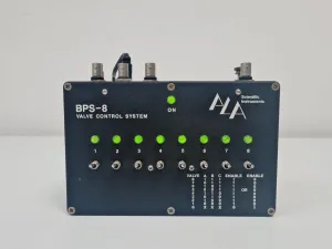 The ALA Scientific Instruments BPS-8 is a robust Valve Control System, previously part of a university laboratory's inventory. It was decommissioned due to it being surplus to the lab's requirements. Currently, the system is in good cosmetic condition and successfully powers on; however, further testing could not be conducted at our facility. The unit includes its power supply, offering a dependable solution for pneumatic and flow control applications in experimental settings.