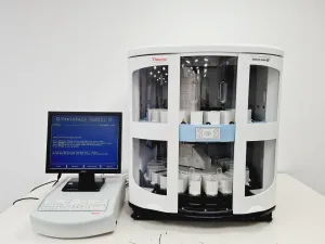The Thermo Scientific Varistain Gemini ES Slide Stainer, sourced from a surplus university lab, is a reliable and efficient instrument for precise staining procedures in histology and cytology. The main unit successfully powers on and passes all self-diagnostic tests, confirming its operational status with no reported defects. Accompanying the stainer are an Acer Monitor and an A78010352 Controller, which connects to the main unit via a serial cable, providing seamless software-driven control. Additionally, included are 9 discs, encompassing various setup and backup protocols for cytology staining. This equipment is ideally suited to modern laboratories requiring consistent and automated slide preparation.