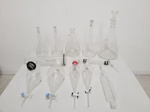 This 12-piece premium lab glassware collection features top brands like Buchi, Schott Duran, Lenz, Pyrex, and Volac. Previously part of a university lab, this glassware set was deemed surplus and is now available. All pieces are in excellent cosmetic condition, free from any damage. The set includes: