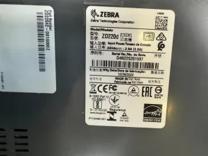 Description: Model: ZD220 Label Printer. Serial No.: D4N225201597. Manufactured: 2022. Voltage: 100-240 V. Frequency: 50-60 Hz. Power consumption and fuse rating: N/A. Software version: N/A.