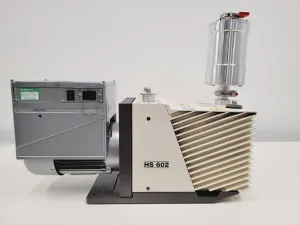 The Agilent HS 602 is a high-performance rotary vane vacuum pump, ideal for a range of laboratory applications. Formerly utilized in a university lab, this equipment was retired due to redundancy. The pump is fully operational, with indicator lights confirming its increasing speed from startup. It delivers consistent and smooth operation, free from unexpected noises or vibrations. The package includes an Oil Exhaust Filter NW25. Model number: 749-9365R002, Serial No.: IT1328A241.