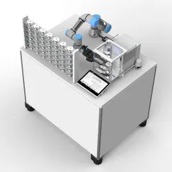 Cobot, which is a robot with a gripper that allows you to transport filters between the magazine and the microbalanc
