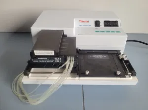 The Thermo Scientific Multidrop 832 is an automatic, programmable, eight-channel microplate dispenser, adept at handling microvolumes with ease. Equipped with a peristaltic pump, it ensures rapid and continuous liquid dispensing into 96 and 384-well microplates. This equipment promises unwavering accuracy, speed, and reliability, allowing users to select the number of columns for dispensing. Its compact dimensions, 31x32x18 cm, and weight of 7 kg, make it an optimal fit for any laboratory environment.