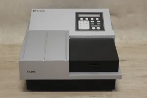 The BioTek EL808 Microplate Reader offers reliable absorbance detection across a range of applications. It supports multiple read methods, including end point, kinetic, and linear scanning, using 96-well plates. The system is equipped with a tungsten halogen light source and a photodiode detector, covering a wavelength range of 380 to 900 nm. It includes filters at 340, 405, 450, 490, and 630 nm, facilitating a dynamic range of 0 to 4.0 OD with exceptional resolution at 0.001 OD. While there is no pathlength correction, the microplate reader ensures OD accuracy better than 1% at 2.5 OD, OD linearity under 1% at 2.5 OD, and repeatability less than 0.5% at 2.5 OD. With a kinetic reading speed of 8 seconds for 96 wells, it offers efficient results. The compact dimensions of 394 x 406 x 222 mm and a weight of 13.6 kg make it ideal for laboratory settings. Please note that software is not included; however, configurations for GEN5 basic, secure, or IVD editions are available separately.
