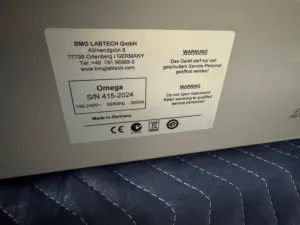 Description: Model: FLUOstar Omega. Serial No.: 415-2024. Voltage: 100-240V. Frequency: 50/60Hz. Power Consumption: 300VA. Fuse Rating: 3.15A. Manufactured in Germany. Connectors include USB and serial interface. The instrument is designed for multi-mode detection including fluorescence, luminescence, and absorbance.