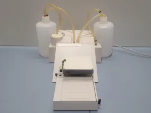 The Labsystems Microplate Washer Autowash I is a sophisticated system designed to efficiently cleanse 96-well microplates. It incorporates a semi-automatic mechanism coupled with a reliable vacuum pump and accompanying bottles to facilitate ease of use. Specifically engineered for high-throughput operations, this system significantly minimizes the washing duration of each plate to just a few seconds, making it an essential tool for laboratories requiring rapid and consistent results.