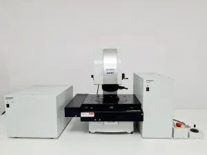 The Olympus Lext OLS3100 Confocal Microscope, accompanied by an MM6-ASPS Controller and OLS3000 Power Supply, offers a sophisticated solution for high-precision imaging in research settings. Originally utilized in a university laboratory, this unit is surplus to requirements but remains in excellent working order. Essential components such as the control unit and stage control function smoothly and are verified operational. Despite the cosmetic condition being generally good, prospective users should note that the rubber foot ends are degrading, and software is not provided. The package includes several key accessories: the Olympus U-DICR, U-P03, and U-AN360-3 units. Vital dimensions and weights for each part of the system are as follows: