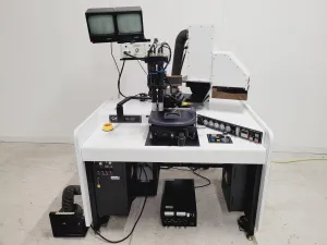 The OAI Optical Associates Model J500/VIS Mask Aligner is a specialist piece of photolithography equipment once part of a university laboratory. Though it powers on, it necessitates refurbishment for complete functionality. Upon inspection, while one optical microscope light illuminated and displayed an image, the other did not, suggesting a replacement bulb is needed labeled "Bulb Blown." Optical cables were exchanged, confirming that the microscope functionality remains intact. The UV Light Controller malfunctions with this unit—audible clicking sounds were noted—though it performed appropriately on a different J500/VIS unit, indicating an issue with the main unit’s UV feature. Mechanical movements of the microscope remain smooth, yet joystick control is non-functional. This equipment is in good cosmetic shape with only superficial marks and is ideal for spares or repairs.