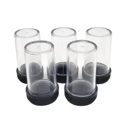 This set includes five microscope objective cases designed to securely store and protect slender objectives featuring the standard RMS (Royal Microscopical Society) 20mm thread.