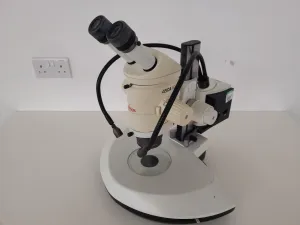 This Leica MZ95 High-Performance Stereomicroscope was removed from a university lab as surplus to requirements. It is in a good used cosmetic condition, exhibiting various marks and signs of general use. The unit has been tested and functions as expected, though note that there is no cable or PSU included for powering the attached Leica L2 gooseneck lamps, which have not been tested.