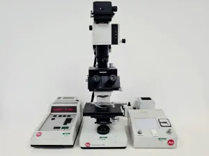 The Leitz Dialux 22 Fluorescence Microscope with Camera and Control Unit is designed for professional laboratory applications, originally sourced from a university lab. This specific unit is non-functional and listed exclusively for spare parts or repair purposes. It includes a Leitz Vario Orthomat Controller, Leitz Power Supply for Lamp (which currently fails a visual PAT test), a Leitz Vario Orthomat 2 Camera, a 100W Lamp (Type: 307-143.003), and a series of NPL and Leitz objectives, including: