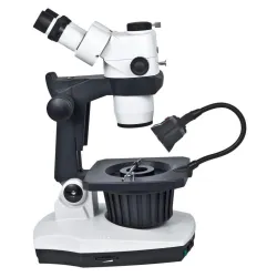 This microscope features a 6.7:1 zoom system with objectives ranging from 0.75X to 5X and a working distance of 110mm, offering flexibility in handling samples. The 360° rotatable base and tiltable stand allow for easy adjustments to viewing angles, while the adjustable iris diaphragm (Ø41mm - Ø2mm) offers precise control over illumination. Incident illumination is provided by a 7W fluorescent light with a gooseneck for adjustability, while transmitted illumination comes from a 6V/30W Quartz Halogen lamp with intensity control and a darkfield illuminator. Complete with a dust cover, stainless steel wire stone holder, and an aluminum carrying case, the Motic GM-171 is a comprehensive tool for professionals in gemology.