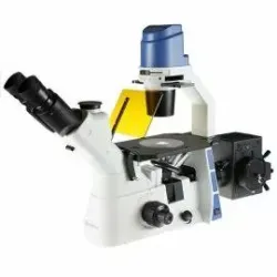 Microscope trinocular inverted for fluorescence Oxion OX.2253-PLF with mechanical stage PL Fluarex 10x/20x/40x and rail for 2 filter blocks, includes carrying case.