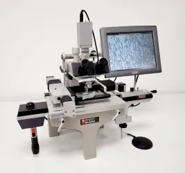 The Singer Instruments MSM 400 Dissection Microscope System was acquired from a university laboratory where it was surplus to requirements. While the specification plate lists it as a model 300, the device powers up to show a MSM 400, suggesting an upgrade at some point. This system is in operational condition, featuring a motorized stage controlled via a joystick, and integrated with a touchscreen monitor for ease of use. The equipped camera and lighting system provide an excellent view of the sample slides on the display. Generally well-maintained, it has a minor imperfection—a bent piece on the right side (refer to photos for details). The package includes a Pixelink PL-B741U camera, two HKW 15x/13 eyepieces, two objectives (M20/0.30 240 and 4/0.10), and all essential cables including the power supply for the monitor.