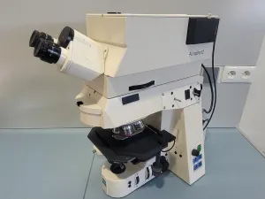 The ZEISS AXIOPLAN 2 Laboratory Microscope (model 452185) is a precision instrument designed for high-quality imaging. It features a set of five N-Achroplan objectives with magnifications of 2.5X, 5X, 10X, 20X, and 40X, offering versatility for varied applications. Equipped with a binocular head featuring Axiophot 2 adjustable eyepieces (Pl 10x/25), it ensures a comfortable viewing experience. This microscope runs on a 230-240V power supply at 50/60Hz and uses a 100W halogen lamp with adjustable light intensity for optimal illumination. Enhanced by a motorized stage and lens support, it provides precision and flexibility, making it ideal for advanced research environments.