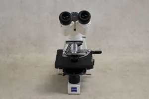 The Zeiss Axiostar Binocular Transmitted Light Microscope boasts a 360° rotating binocular head and an E-Pl 10x/20 mm eyepiece. It is equipped with A-Plan objectives offering magnifications of 10x/0.25 Ph1, 20x/0.45 Ph2, and 40x/0.65 Ph2. The microscope features a quadruple, reversed nosepiece and a 2-layer mechanical sliding stage with dimensions of 160 x 140 mm. Focusing is facilitated by coaxial coarse and fine control knobs, and the unit includes an efficient LED illuminator for optimal lighting conditions.