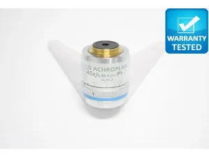 The ZEISS LD ACHROPLAN 40x/0.60 Korr Ph2 Microscope Objective is a precision-engineered dry objective lens designed for high-resolution microscopy applications in cell imaging and molecular diagnostics. Featuring a 40x magnification and a numerical aperture (NA) of 0.60, this objective supports phase contrast microscopy (Ph2) to enhance visualization of transparent biological specimens without staining.