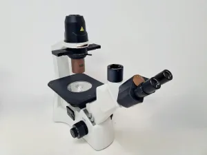 The instrument is in good cosmetic condition, with minor marks indicating previous use. This inverted microscope is ideal for educational environments and various research applications requiring an advanced infrastructure for imaging and analysis.