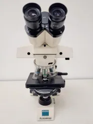 This Zeiss Axioskop Fluorescence Microscope System was extracted from a university laboratory as it was no longer needed. Despite being used, the equipment is in good cosmetic condition with minor marks from previous use and has been tested, although the power supply unit for the mercury lamp is not included. The package features two eyepieces, Zeiss Pl 10x/20 (44 40 32), and three objectives: Zeiss plan-NEOFLUAR 100x/1.30 oil (44 04 81) PH3, Zeiss plan-NEOFLUAR 40x/0.75 oil (44 03 51) PH2, and Zeiss plan-NEOFLUAR 20x/0.50 oil (44 03 41) Ph2.