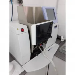 Perkin Elmer AAnalyst 200 atomic absorption flame spectrophotometer. Double-beam echelle optical system. Deuterium background corrector. Echelle monochromator. Focal length: 300 mm. Wavelength range: 189-900 nm. Spectral bandpass: 0.15 nm at 200 nm. Reciprocal linear dispersion: 2.4 nm/mm. High-efficiency, segmented solid-state detector. Hollow cathode lamps (HCLs) and electrodeless discharge lamps (EDLs). Touch-screen interface with built-in software for lamp setup, flame control, parameter selection and sample analysis. The tools menu provides access to recommended conditions, sample information, method storage and recall, data transfer and service diagnostics screens. Includes waste can and Al-Ca-Cu-Fe-Mg-Si-Zn and Pb lamps. USB user manual.