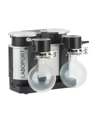 Laboport SR 820 G by KNF is a chemical-resistant vacuum pump system that features an N 820 G diaphragm vacuum pump, mounted on a base plate with two separator bottles on the suction and pressure sides. Designed for optimal performance, it handles extremely aggressive or corrosive gases and vapors thanks to its high steam and condensate compatibility.