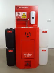 The Armorgard ScrubKart Mobile Hand Wash Station was acquired from a university laboratory where it was deemed surplus to requirements. The unit is confirmed by the site to be in good working condition. While it powers up successfully, further testing has not been conducted. It presents a good cosmetic condition, albeit with minor usage marks. Accompanying the station are four 10-liter liquid containers: two designated for clean water and two for wastewater. Overall dimensions are L 65 cm x W 75 cm x H 1456 cm, offering a compact and efficient solution for on-site sanitation needs.