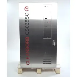 The CS Clean Systems CLEANSORB CS 065 SC Scrubber, manufactured by CS CLEAN SYSTEMS GMBH, provides a reliable solution for abating hazardous gases in laboratory environments. The CLEANSORB LABLINE is equipped with a small absorber column housed within a compact, air-extracted cabinet, making it suitable for sporadic laboratory applications. Its passive operating principle ensures readiness without needing activation, heating, or switching on before new experiments. The chemisorber media's wide selectivity caters to an extensive variety of gases and liquid precursors, offering optimal flexibility for R&D needs. This system boasts negligible installation costs, straightforward operation, long column lifespan for R&D applications, low running costs, and the capability to handle combined vent purge gases from multiple gas cabinets. It features a front panel control with parameter display, volt-free contacts, and a digital signal interface. Technical specifics include a top connection for cabinet air extraction, Swagelok connectors for compressed air and nitrogen, and an included TX-4000 KFP Gas Detector. The scrubber is in excellent condition, fully functional, and was recently extracted from a running laboratory.