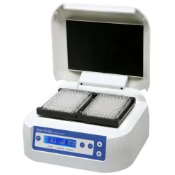 Termoagitadores MB100 Series. Models: MB100-2A (2 microplates); MB100-4A (4 microplates). Range temperature: RT+5ºC to 70ºC. Timer from 1 min to 99h59min. Resolution: ± 0.1 ºC. Accuracy: ± 0.5 º. Speed of agitation from 100 to 1200 rpm. Orbit 2 mm warm-up Time (20ºC to 70ºC) ≤25 min.