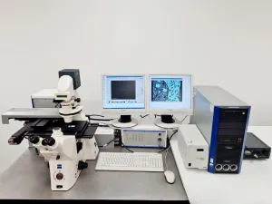 The ZEISS PALM CombiSystem Axiovert 200M is a sophisticated laboratory setup that was previously utilized in a university setting. It features a robust inverted microscope integrated with P.A.L.M Microlaser Technologies' microdissection system and comes equipped with the Palm RoboSoftware V4 to control stage movement, motorized objectives, and lighting adjustments. Key components include a Hitachi HV-D30 camera, a Laser Quantum Forte power supply, and an EXFO X-Cite Series 120 light source. The system is powered by a Fujitsu Siemens Celsius R630 PC and is stationed on a Melles Griot Optical Table. The included components work cohesively to enhance microdissection and imaging precision. Despite minor cosmetic wear, the system is in excellent working condition, offering a comprehensive solution for advanced microscopy research.