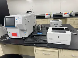 The Sysmex XN-350 Automated Hematology Analyzer is a compact, high-performance instrument designed for efficient hematology testing. It includes a barcode scanner, keyboard, and HP LaserJet printer for streamlined laboratory workflow.