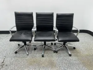 This set includes three leather office chairs featuring padded leather seats and durable metal armrests for ergonomic support and comfort. Each chair is mounted on a five-wheel swivel base, enabling smooth mobility and stability in office environments. The adjustable height mechanism allows customization for optimal seating posture during extended desk work. These office chairs combine professional aesthetics with functional design, ideal for furnishing corporate or home workspaces efficiently.