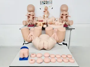 This comprehensive maternity birthing simulator from Limbs & Things and Adam Rouilly is ideal for training healthcare professionals in various obstetric procedures, including cervix examination and childbirth simulations. The set includes two cervix examination sets, two birthing simulators with removable bumps, and two Prompt birthing trainers. Additionally, it features basic obstetric models, babies with detachable placentas, an anatomically correct baby model, a childbirth graphics baby doll with a realistic head, and a peritoneal lavage trainer. Accompanying the equipment are laminated quick setup guide posters for easy reference. Although the items are generally in good cosmetic condition, some latex components may show signs of wear.