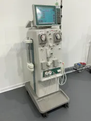The Nikkiso DBB-07 is an advanced hemodialysis machine designed for clinical renal therapy and patient blood purification. Equipped with the DSP-07 touchscreen control panel, it enables precise operation and real-time monitoring of dialysis parameters. The system supports standard fluid and pressure monitoring critical for maintaining treatment efficacy and patient safety during bioprocessing workflows in clinical diagnostics and biotechnology applications.