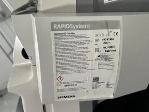 The Siemens Rapidpoint 500 is an automated blood gas analyzer engineered for rapid and precise clinical testing of blood gases, electrolytes, and metabolites. It operates on a voltage range of 100-240 Vac with a frequency of 50/60 Hz, consuming 150 VA power, and is equipped with a T 1.25 AMP 250V fuse. This device features an integrated touchscreen interface coupled with an automatic quality control cartridge system to ensure reliable results and ease of operation.