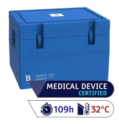 Remarkable for its passive refrigeration capability, the cold life extends up to 109 hours at 32°C and 74 hours at 43°C. This transport solution adheres to international safety standards, being compliant with ADR, RID, IMDG, ICAO-TI, IATA-DGR regulations, and is certified as a Class IIa medical device in accordance with MDD 93/42/EEC.